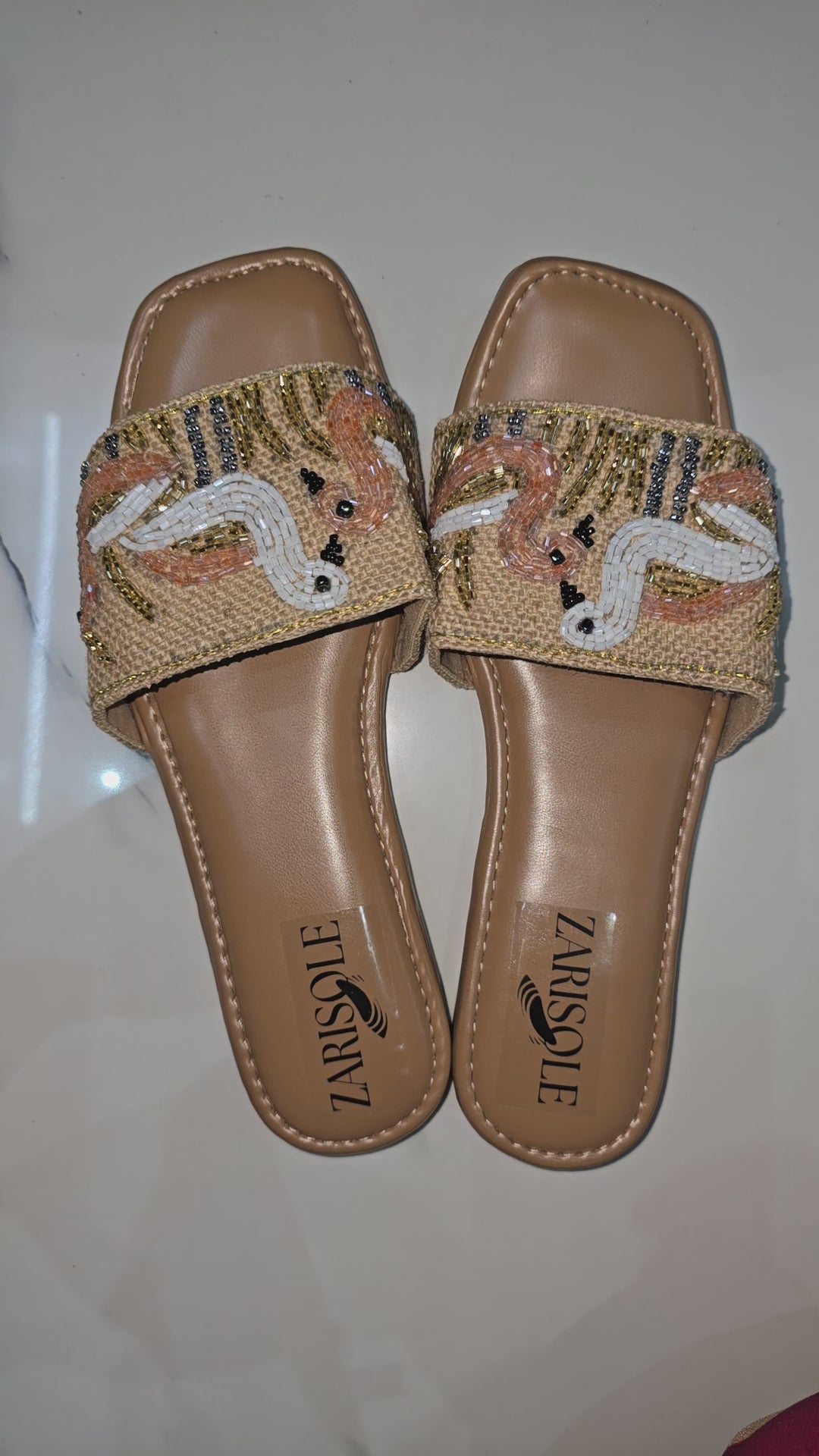 ✨ Add a touch of effortless elegance to your look with these hand-embellished flat sandals. 🐚 Decorated with delicate shells and beads, they pair beautifully with both ethnic and western outfits. πŸ’« Designed with a soft cushioned sole for all-day comfort, these sandals are perfect for daily wear or festive occasions. πŸŽ€